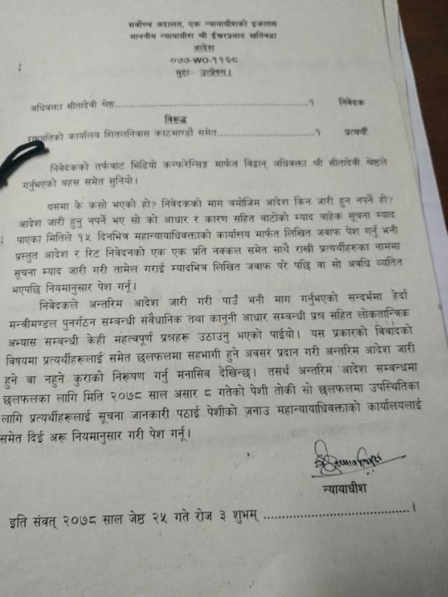 मंगलबार न्यायाधीश इश्वर प्रसाद खतिवडाको एकल इजलासले अन्तरिम आदेश अघि छलफल गर्नुपर्ने भन्दै दुवै पक्षलाई असार ८ मा बोलाउने आदेश गरेको छ ।
