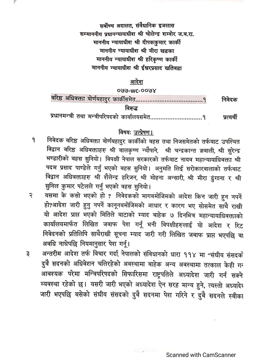 नागरिकता अध्यादेश सम्बन्धी मुद्दाको सुनुवाइका लागि प्रधान न्यायाधीशले वरिष्ठ न्यायाधीश सम्मिलित इजलास गठन गरेका थिए । प्रधानन्यायाधीश चोलेन्द्र शम्शेर जबराले आफ्नो नेतृत्वमा न्यायाधीश दीपककुमार कार्की, मीरा खड्का, हरिकृष्ण कार्की र ईश्वरप्रसाद खतिवडालाई इजलासमा राखेका छन् ।