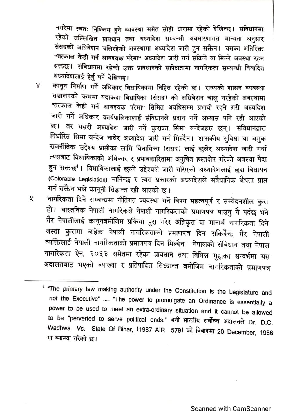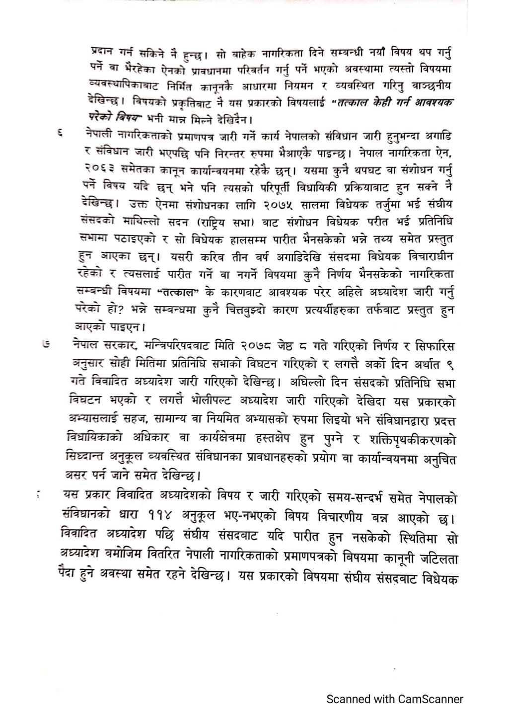 संवैधानिक इजलासले गरेको आदेशमा भनिएको छ– ‘विवादित अध्यादेश पछि संघिय संसदबाट यदि पारित हुन नसकेको स्थितिमा सो अध्यादेश बमोजिम वितरित नेपाली नागरिकताको प्रमाणपत्रको विषयमा कानुनी जटिलता पैदा हुने अवस्था समेत रहने देखिन्छ ।’