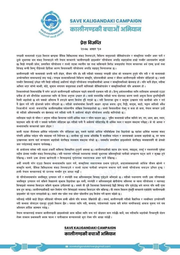 बिहिबार ‘कालीगण्डकी बचाऔं अभियान’को तर्फबाट एक प्रेस विज्ञप्ति जारी गर्दै विनाशकारी परियोजना तत्काल रोक्न केन्द्र सरकारकाे ध्यानाकर्षण गराएका हुन् ।