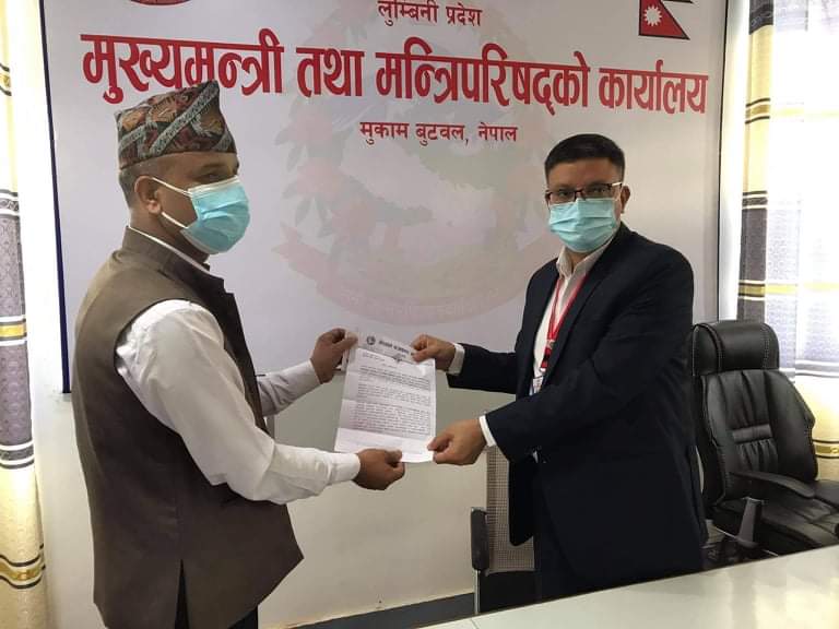बुटवल,२० असार । लुम्बिनी प्रदेश सभामा दर्ता भएको संचार सम्बन्धि विधेयक पुनर्लेखनकाे माग गर्दै नेपाल पत्रकार महासंघ रूपन्देहीले आज मुख्यमन्त्री तथा मन्त्रीपरिषदकाे कार्यालयमा ज्ञापनपत्र बुझाएको छ ।