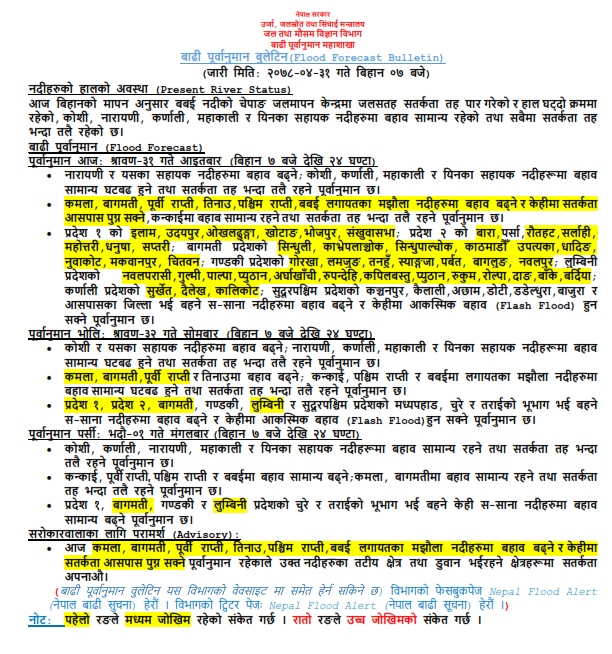 आज लुम्बिनी प्रदेशको नवलपरासी, गुल्मी, पाल्पा, प्युठान, अर्घाखाँची, रुपन्देही, कपिलवस्तु, प्युठान, रुकुम, रोल्पा, दाङ, बाँके, बर्दिया, कर्णाली प्रदेशको सुर्खेत, दैलेख, कालीकोटलगायतका जिल्ला भएर बग्ने नदी तथा खोलाहरुमा पनि बाढी आउने सम्भावना छ ।