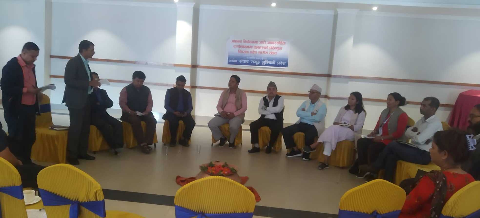 संवाद समूह लुम्बिनीद्धारा शनिबार बुटवलमा आयोजित ‘आशन्न निर्वाचनमा जारी आचारसंहिता कार्यान्वयनमा दलहरुको प्रतिवद्धता’ बिषयक प्रदेश स्तरीय संवाद कार्यक्रममा राजनीतिक दल तथा सरोकारवालाहरुले निर्वाचन आचारसंहिता पालना गर्ने प्रतिवद्धता जनाएका हुन् ।