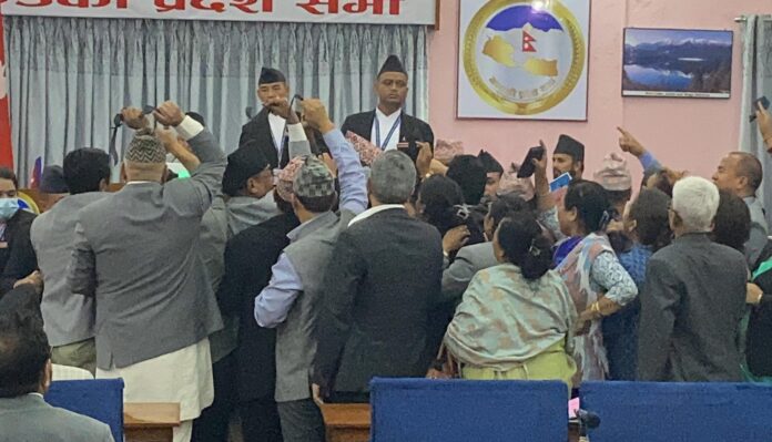 सभामुखको उक्त घाेषणापछि कांग्रेसका प्रदेश सभा सदस्यहरूले संवैधानिक मर्यादा कायम गर, असंवैधानिक प्रक्रिया मान्दैनौँलगायतका नारा लगाउँदै कालोझण्डासहित प्रदर्शन गरेका थिए ।