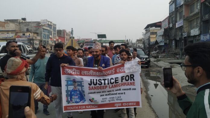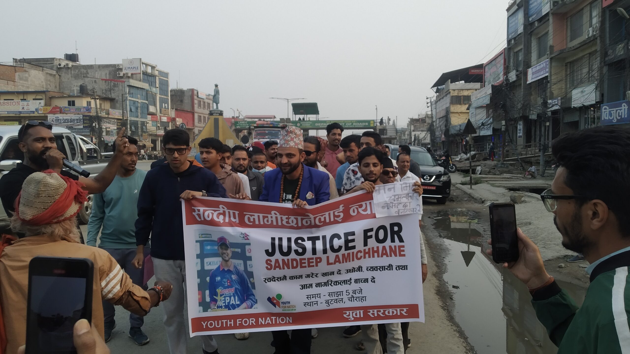 क्रिकेटर सन्दिप लामिछानेलाई न्याय दिनुपर्ने माग गर्दै युवाहरूको एक समुहले बुटवलमा प्रदर्शन गरेकोे छ ।