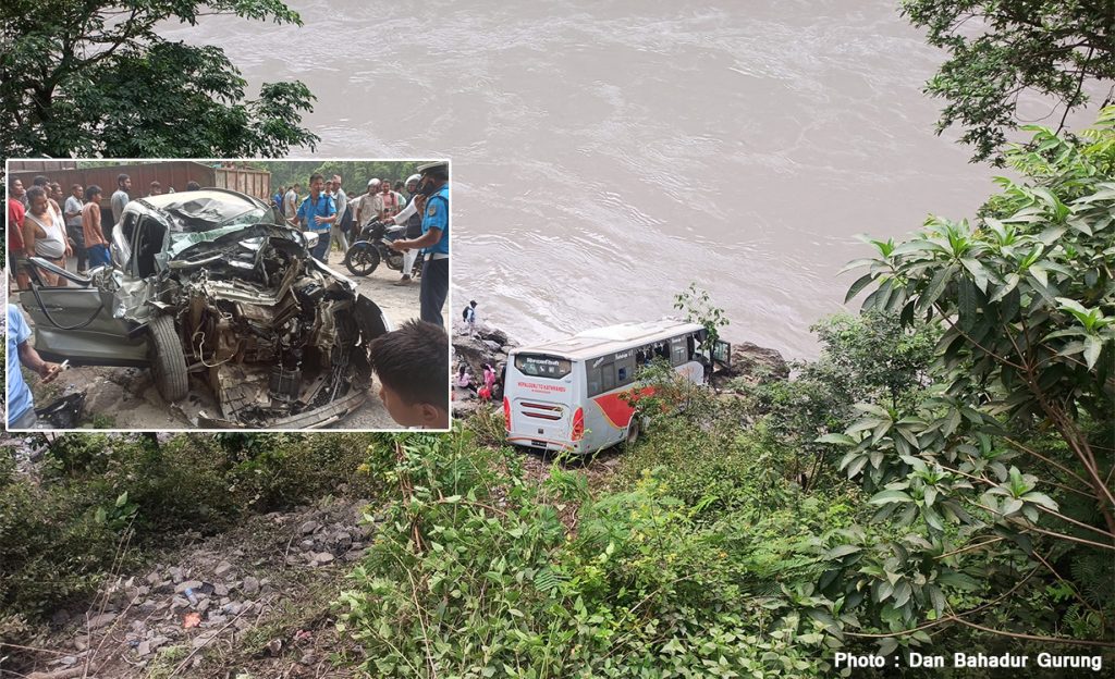 बस त्रिशुली नदी किनारमा खसे पनि कार भने सडक किनारमै छ । कारमा सवार २ जनाको अवस्था गम्भीर छ । टाउकोमा गम्भीर चोट लागेका कार चालक पोखरा महानगरपालिका ५ का ३५ वर्षीय समिर ओझा र टाउकोमा नै चोट लागेका सोही कारमा सवार काठमाडौंको टोखा नगरपालिका ६ टोखाका २२ वर्षीय शेखर मिश्रको पुरानो मेडिकल कलेज भरतपुरमा उपचार भैरहेको छ ।