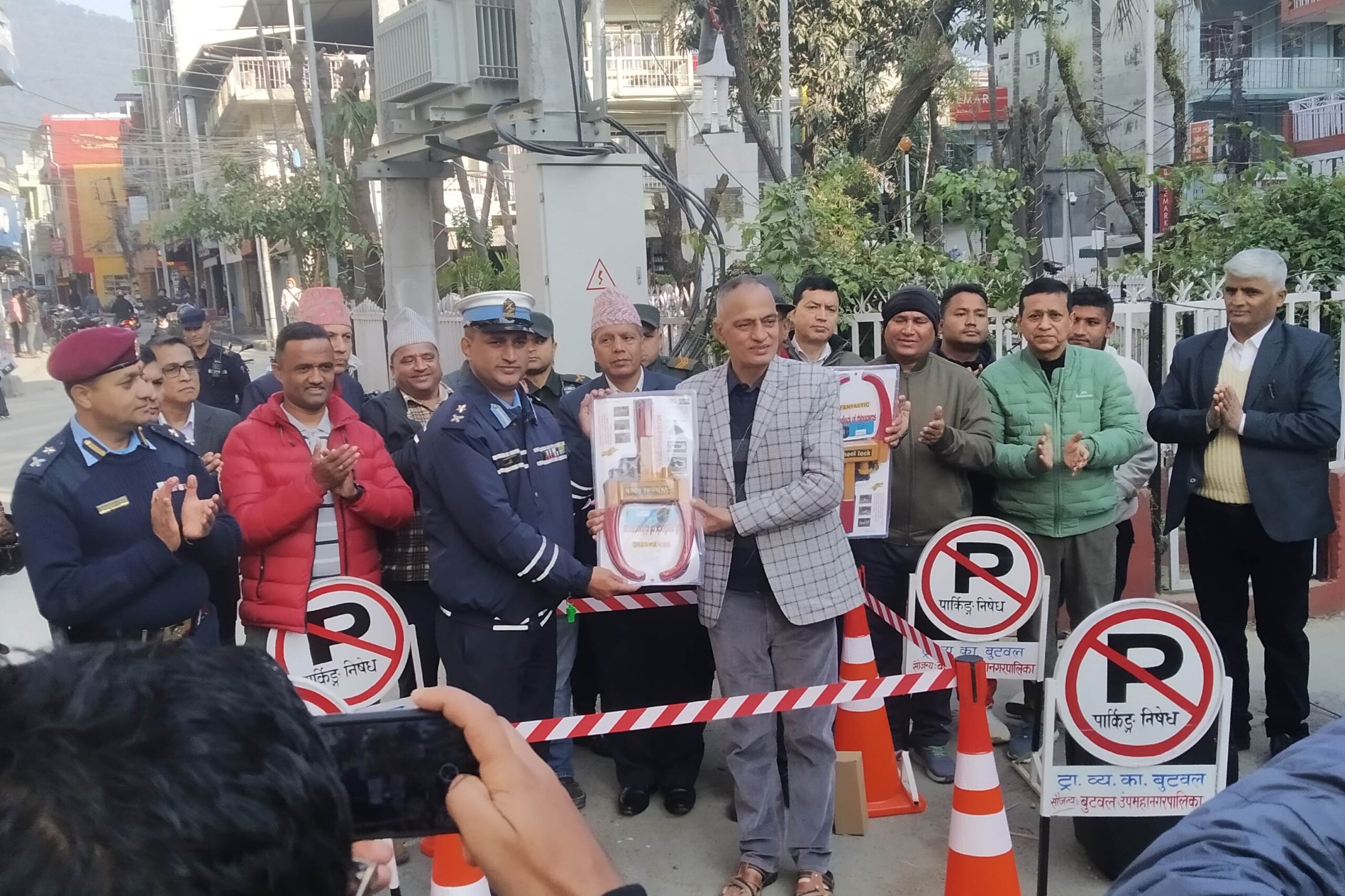 आइतबार बिहान एक कार्यक्रमकाबीच बुटवल उपमहानगरपालिकाका नगर प्रमुख खेलराज पाण्डेयले ट्राफिक प्रहरीलाई पार्किङ ब्यवस्थापन सम्बन्धि सामाग्री हस्तान्तरण गरी साे कार्यकाे शुभारम्भ गरेका हुन् ।