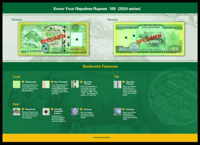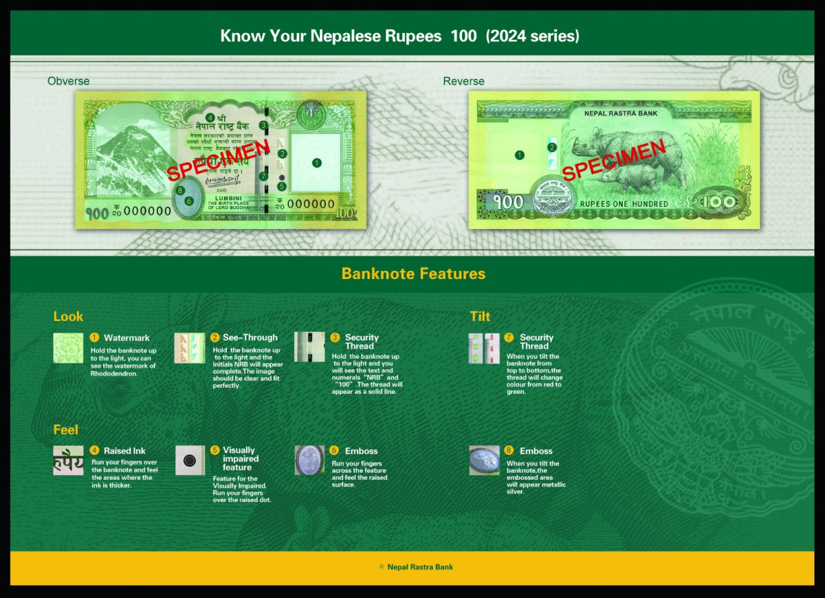 नेपाल राष्ट्र बैंकले एक सय रुपैयाँको नयाँ नोट आज (मंसिर ११ गते) बाट प्रचलनमा ल्याएको हो । उक्त नयाँ नोटमा निःवर्तमान गभर्नर महाप्रसाद अधिकारीकाे हस्ताक्षर रहेको छ ।