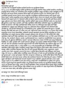 ‘तथापि पार्टीको हितमा निर्णय लिनु पर्दा, कमिटी निर्णय पालन गर्ने गराउने क्रममा, कतिपय बेला प्राथमिकता निर्धारण गरेर निर्णय लिनु पर्ने अबस्था र निर्णयमा पुग्नुका सबै बिबरण पार्टी गोपनियताको कारणले जानकारी गराउन नमिलेको अबस्थाले कसैमाथि अन्याय भएको अनुभूत भएको छ भने म व्यक्तिगत रुपमा क्षेमा प्रार्थी छु,’ उनले लेखेका छन्,‘पार्टीको एघारौँ महाधिवेशन, नेकपा एमालेलाई वर्तमान देशको जटिल राजनीतिक परिस्थितिको सामना गर्न सक्ने निर्णायक राष्ट्रिय शक्तिको रुपमा पुन स्थापित गर्न, सक्षम नेतृत्व निर्माण गर्दै ऐतिहासिक र भब्य रुपमा सफल रहोस्, यही हार्दिक शुभकामना ब्यक्त गर्दछु ।’