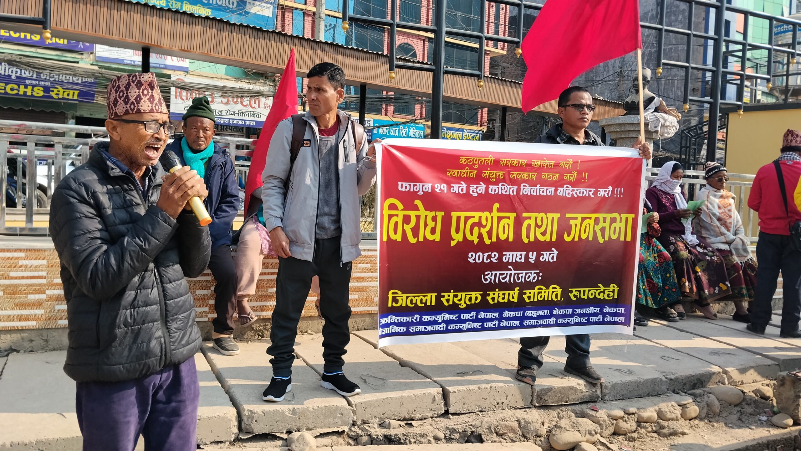 चुनाव बहिष्कारका लागि गठित जिल्ला संयुक्त संघर्ष समिति रूपन्देहीद्वारा साेमबार बुटवलकाे अस्पताललाइनमा बिराेध प्रदर्शन तथा जनसभा सम्पन्न गरेको हो ।
