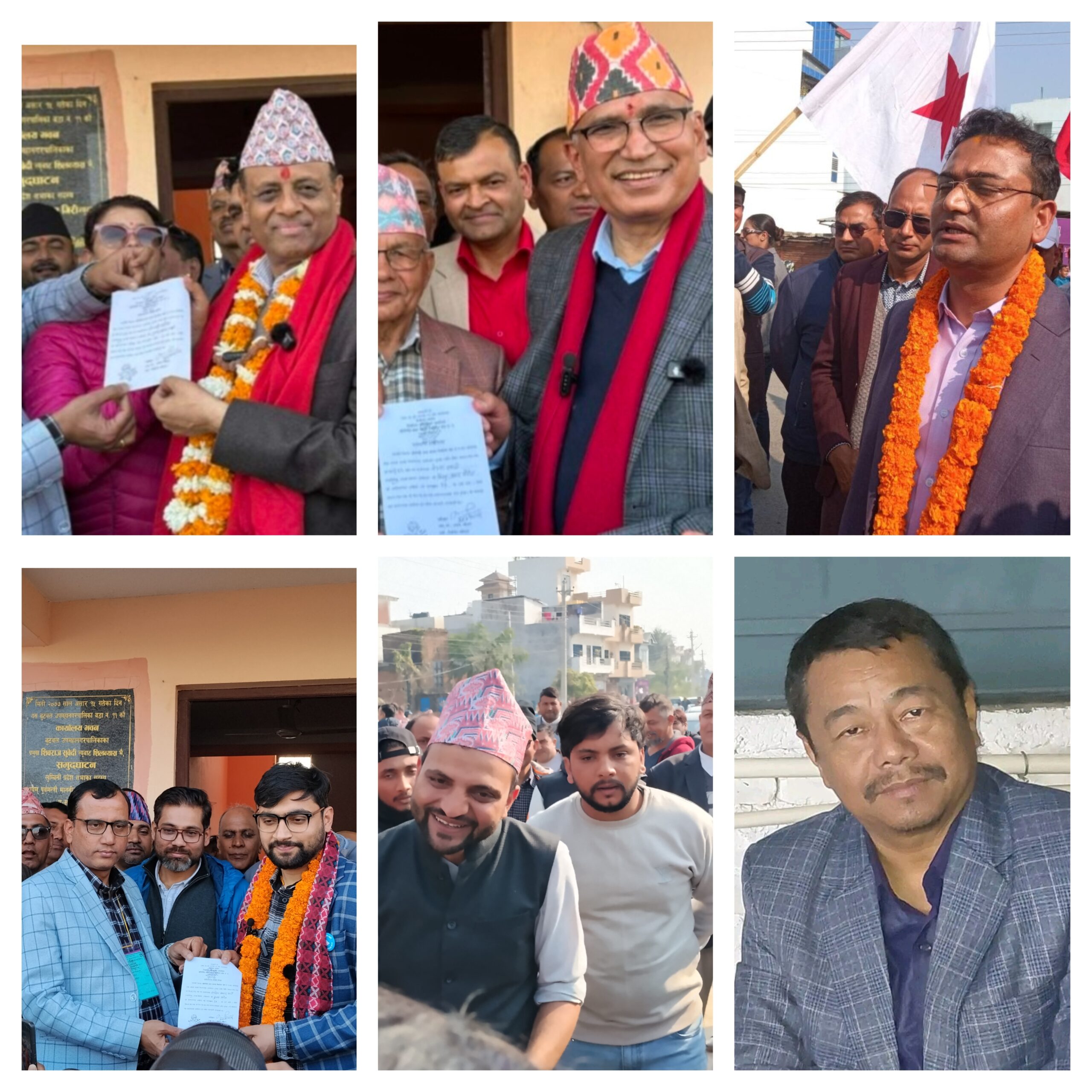 उनका अनुसार राप्रपाबाट कर्भिका थापा, नेपाली जनता दलबाट राजु पौडेल, जनसेवा पार्टीबाट निकोलस भनिने कमल भुसाल, राष्ट्रिय जनमोर्चाबाट रुकबहादुर पराजुली, जनता समाजबादी पार्टी नेपालबाट दिपक गुरुङ,नेकपा माओवादीबाट बीरेन्द्र बिक, राष्ट्रिय जनमुक्ति पार्टीबाट केशवबहादुर थापा,श्रम संस्कृति पार्टीबाट भिमबहादुर गौतम, समावेशी समाजवादी पार्टीबाट देवेन्द्रबहादुर खत्री, प्रगतिशील लोकतान्त्रिक पार्टीबाट नारायणप्रसाद नागिला, मंगोल नेसन अर्गनाइजेनबाट चन्द्र कुमारी गुरुङ,नेपाल मजदुर किसान पार्टीबाट रोशिना ब्यन्जु र नेसनल रिपब्लिक नेपालबाट थम्मन बहादुर बुढा मगरले मनोनयन दर्ता गरेका छन् ।