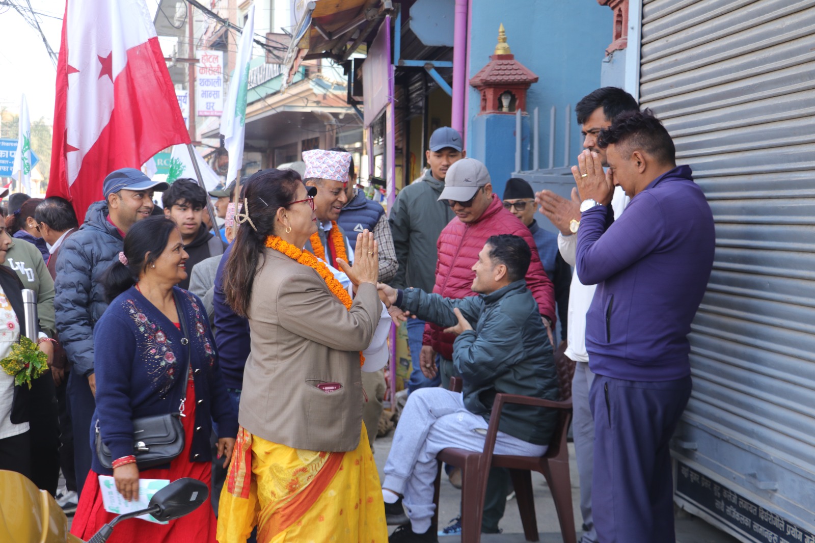 लोकतन्त्रको सुन्दर अभ्यास भएको बताइन् । समानुपातिक प्रणालीमार्फत समावेशी आवाज संसदमा पु¥याउने हाम्रो दायित्व हो ओलीले भनिन् । त्यसैगरी दिउँसो १ बजेपछि अभियान बुटवल उपमहानगरपालिका–११ तर्फ मोडिएको थियो ।कालिकानगर सर्भिस लेनबाट सुरु भएको घरदैलो होराइजन चोक, योगीकुटी, माझगाउँ, देवीनगर हुँदै तल्लो देवीनगरसम्म पुगेको थियो ।वडा नं. ११ का बासिन्दाले सडक स्तरोन्नति, ढल निकास, खानेपानी र सहरी पूर्वाधार सुधारको माग राखेका थिए । उम्मेदवारहरूले स्थानीय तहसँग समन्वय गरी चरणबद्ध रूपमा समस्या समाधान गर्ने प्रतिबद्धता व्यक्त गरेका छन् । कार्यक्रममा स्थानीय नेता, कार्यकर्ताहरुको सहभागिता रहेको थियो ।
