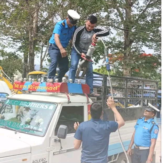 ट्राफिक प्रहरीले आइतबार बिहान बुटवल उपमहानगरपालिका–३ चिडियाखोला क्षेत्रमा करिब १५० वटा सवारी साधनमा नियम बिपरित जडान गरिएका फग लाइट र प्रेसर हर्न हटाउन लगाएको थियो ।